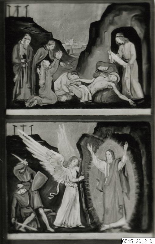 Bilden visar en del av altarskåpet i Södra Sallerups kyrka, målat av Hugo Gehlin. Det är två mindre målningar som skildrar bibliska scener.