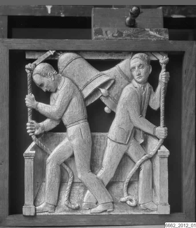 Bilden visar en genombruten relief som är utskuren i ek och förgylld utan kredering. Motivet är två män som ringer i kyrkklockor.