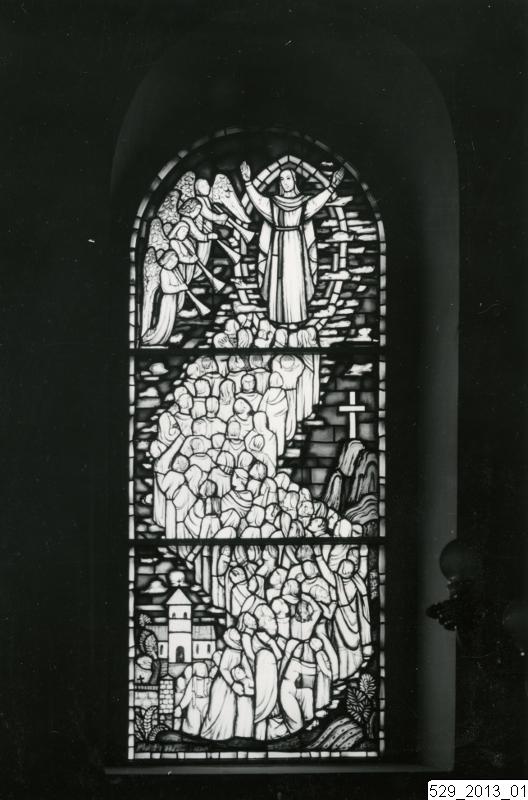 Bilden visar en glasmålning i Munka-Ljungby kyrka av Hugo Gehlin. Uppståndelsens dag, 1945.