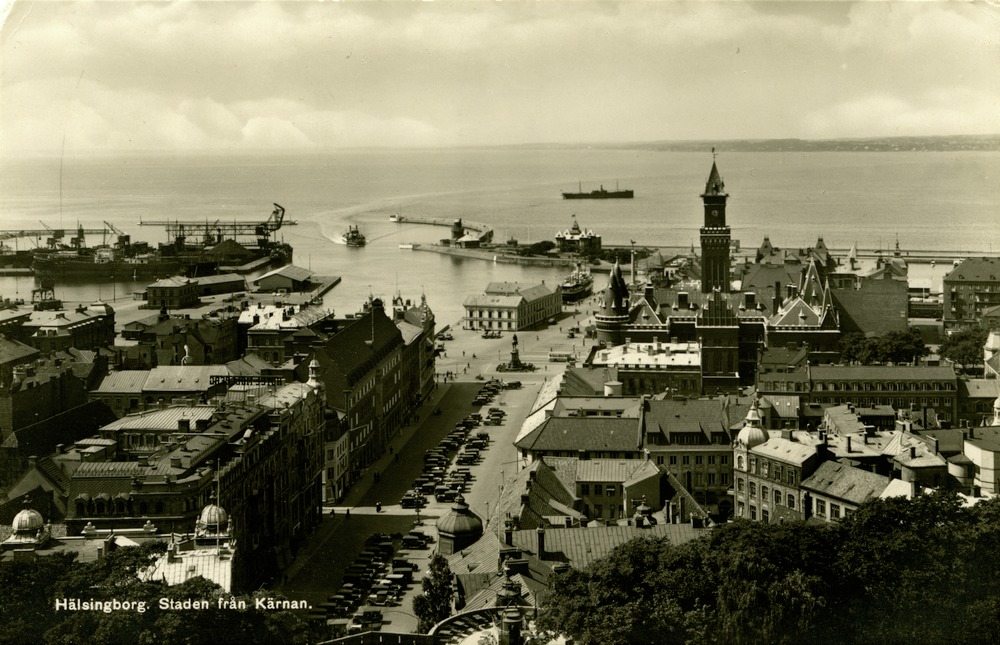 Vy över Helsingborg. Bilden tagen från Kärnan. Vykortet är sänt från "tre fastrar" till Måns-Klas-Olle Johnsson i Örebro till hans 2-årsdag.