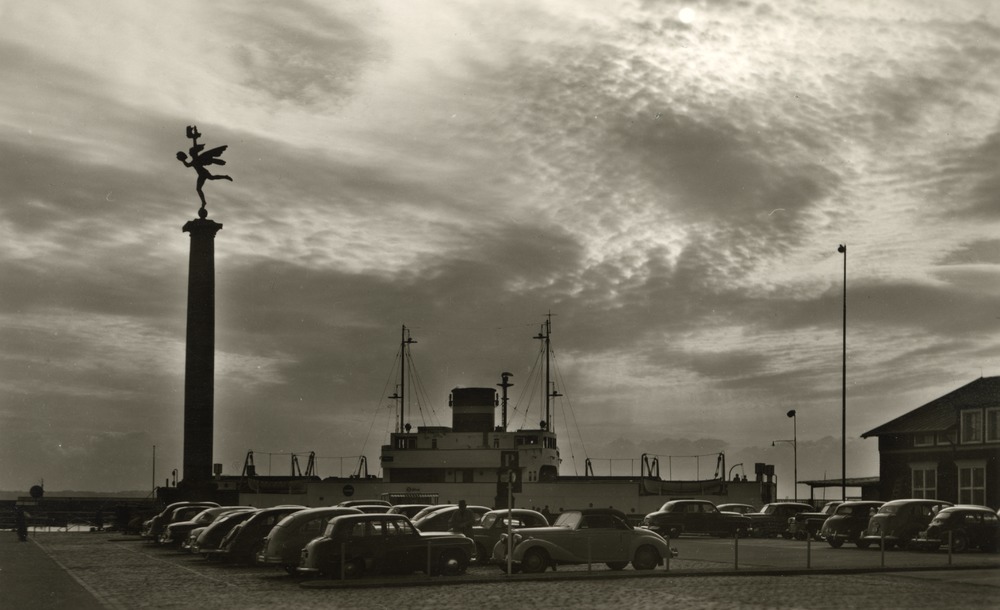 Svartvitt vykort föreställande Hamntorget i Helsingborg med Sjöfartsgudinnan i bakgrunden..