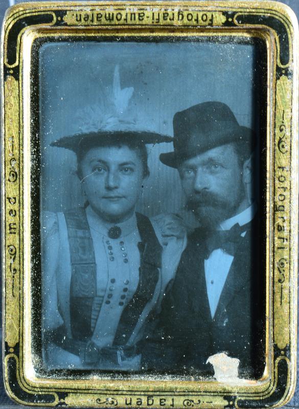 Svartvitt fotografi, ferrotyp, på en metallbricka av ett par i halvbild halvprofil. text på baksidan: "Minne från Industripalayset". Med pappfodral med text: "...Hamburg 1895 ".