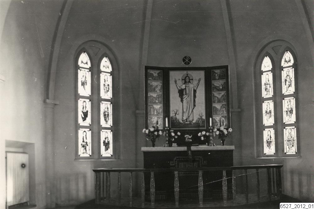 Bilden visar en interiör från Södra Sallerups kyrka. I centrum altare, altarskåp och altarring. På vardera sidan om altaret ett fönster. På altaret ljusstakar och blomvaser. Altarskåp och fönster av Hugo Gehlin.