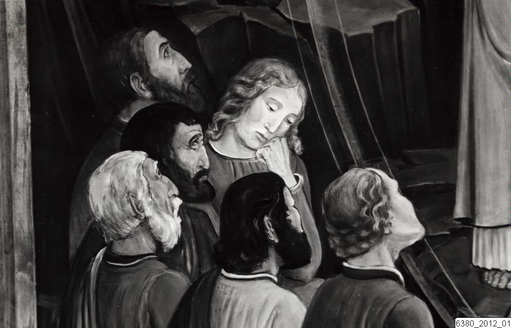 Bilden visar en detalj av altartavlan i Reslövs kyrka, målad av Hugo Gehlin 1933. Motivet är de sex lärjungarna till vänster på altartavlan.