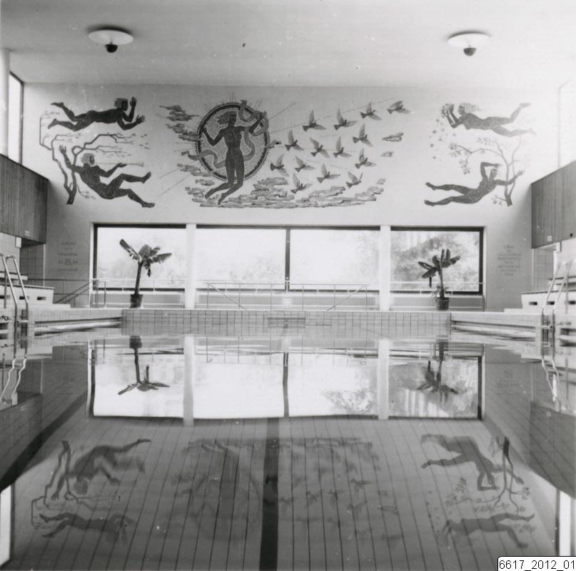 Bilden visar mosaiken Aurora och Vindarna i Trelleborgs simhall, skapad av Hugo Gehlin 1942-43. I bildens nedre del bassängen. I bildens mitt panoramafönster och mosaiken som täcker hela kortväggen. I taket två lampor.