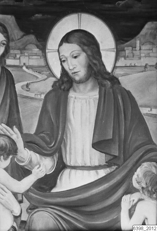 Bilden visar en detalj av altartavlan i Bårslövs kyrka, målad av Hugo Gehlin 1928. Motivet är den sittande Jesus och två barn.