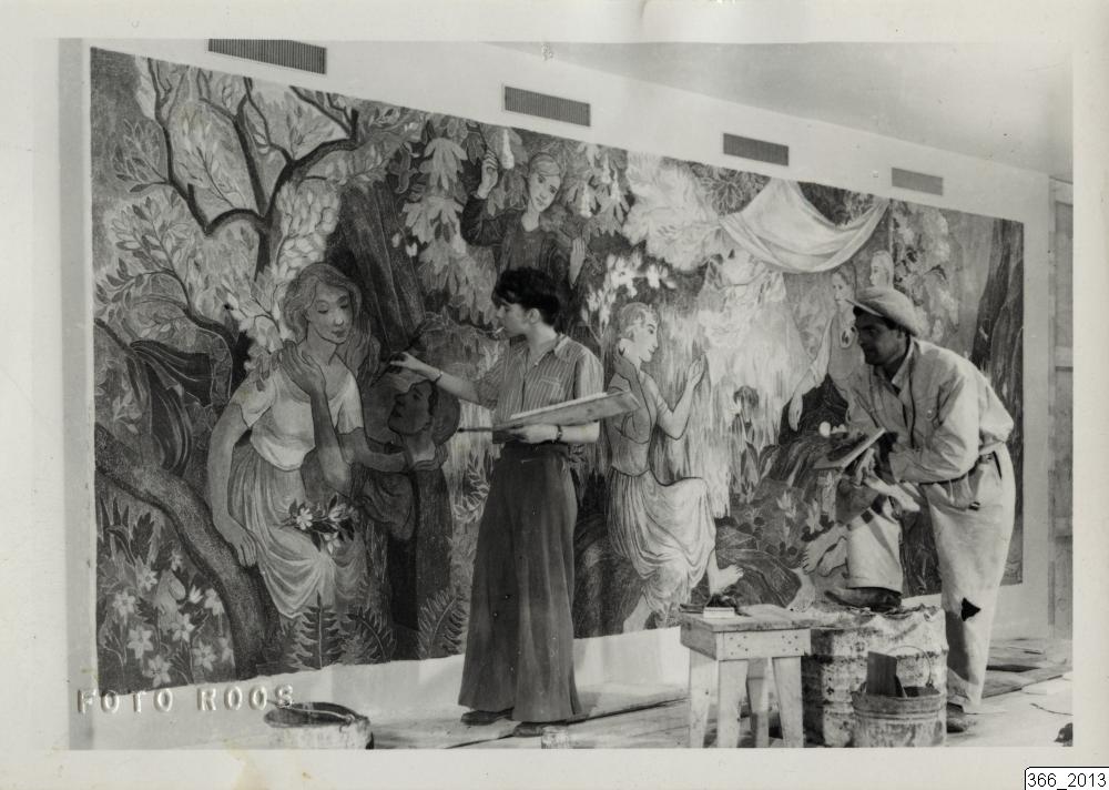 Bilden visar en person som jobbar med en väggmålning av Hugo Gehlin.
