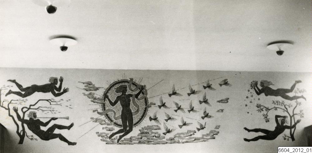 Bilden visar mosaiken Aurora och Vindarna i Trelleborgs simhall, skapad av Hugo Gehlin 1942-43. I bildens nedre del mosaiken som täcker hela kortväggen. I taket tre lampor.