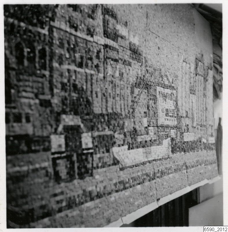 Bilden visar en del av en glasmosaik, Staden vid Sundet, på badhuset på Söder i Helsingborg. Motivet är Helsingborg sett från Öresund, från Sofiero till Råå.
