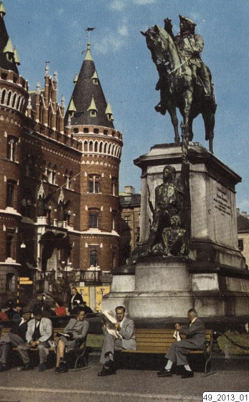 Bilden visar rådhuset och Stenbocksstatyn i Helsingborg. Framför statyn sitter människor på bänkar.