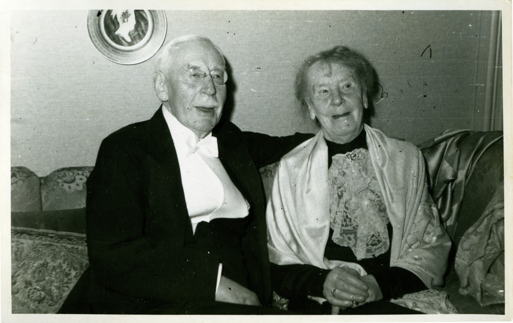 Porträtt av makarna Johan och Hildur Löfgren sittandes i en soffa. Fotografiet är sänt som ett vykort till paret från en "gäst". Vykortet är sänt till parets adress Strandvägen 57 i Stockholm.