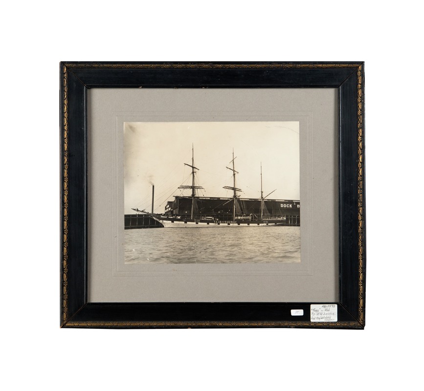 Inramat, svartvitt fotografi föreställande fartyget "Tana". Bilden är monterad på grå papp i en svart och guldig träram.