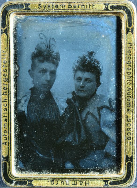 Svartvitt fotografi, ferrotyp, på en metallbricka av två kvinnor i halvbild halvprofil inom pappfodral med text: "...Hamburg 1895 " samt "50 pfg".