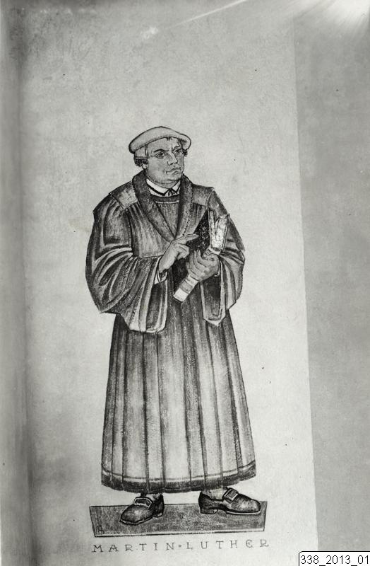 Målningen föreställer Martin Luther, stående med en bok i handen.