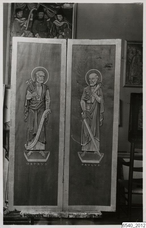 Bilden visar kyrkmålningar av Hugo Gehlin. Motivet är apostlarna Petrus och Paulus. Troligen är det målningar på luckorna till altarskåpet i Södra Sallerups kyrka.