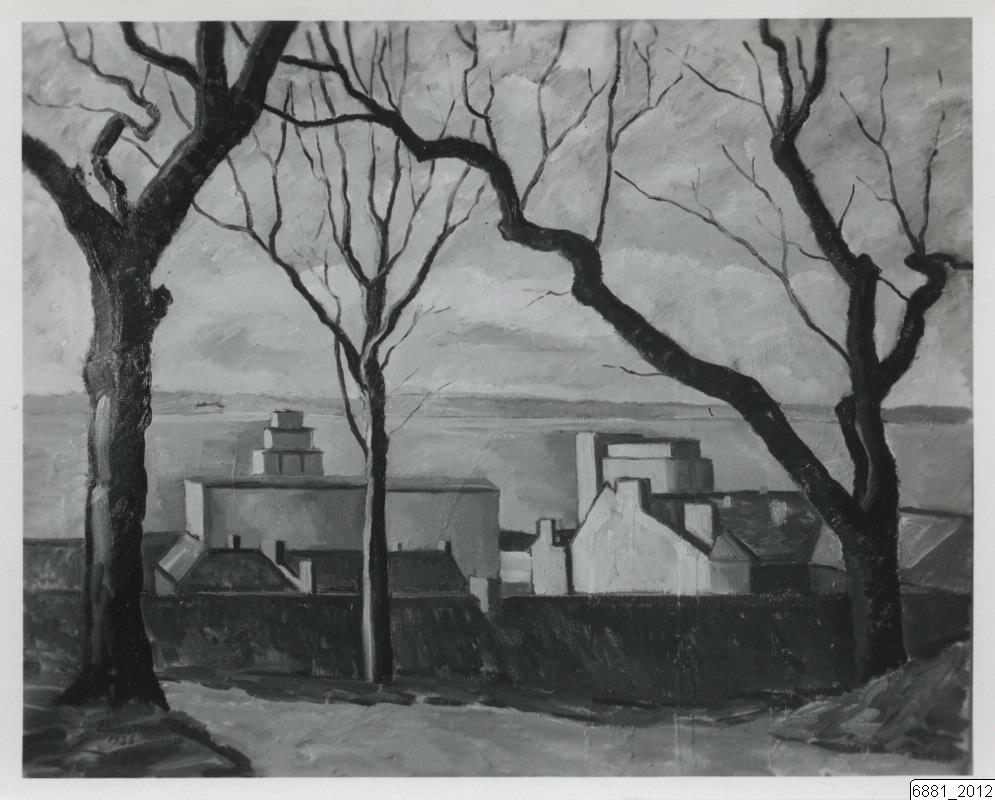 Ett landskap med träd och byggnader, och i bakgrunden syns Öresund.