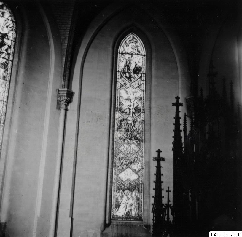 Bilden visar en glasmålning i en kyrka, okänt var den finns.