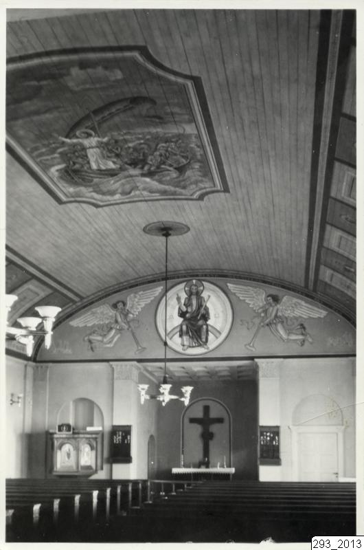 I bildens nedre del syns lampor, kyrkbänkar, predikstol och korset på altaret.