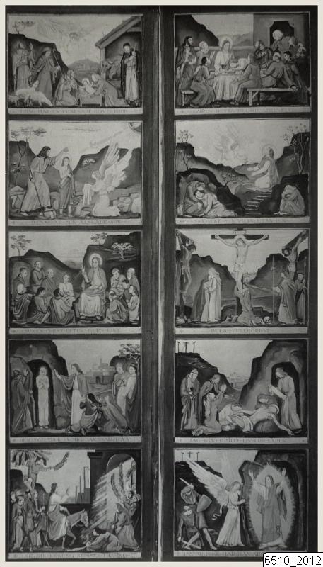 Bilden visar en del av altarskåpet i Södra Sallerups kyrka, målat av Hugo Gehlin. Det är tio mindre målningar som skildrar bibliska scener.