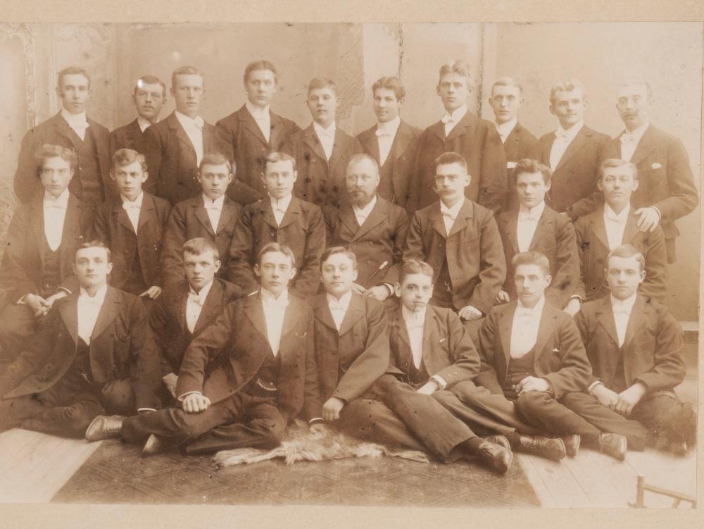 Svartvitt fotografi inom glas och ram föreställande manskören "Harmoni" i Helsingborg