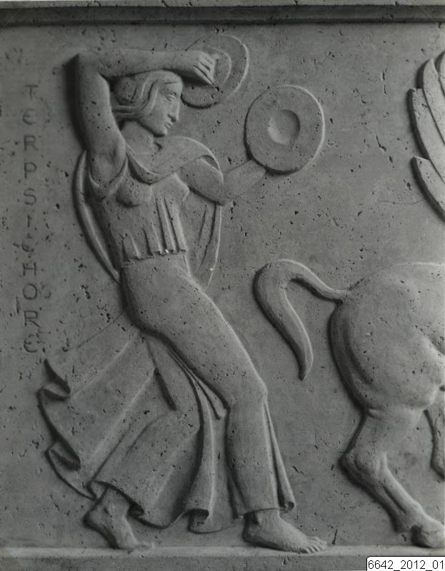 Bilden visar en detalj av en relief, De nio musernas relief, skapad av Hugo Gehlin.