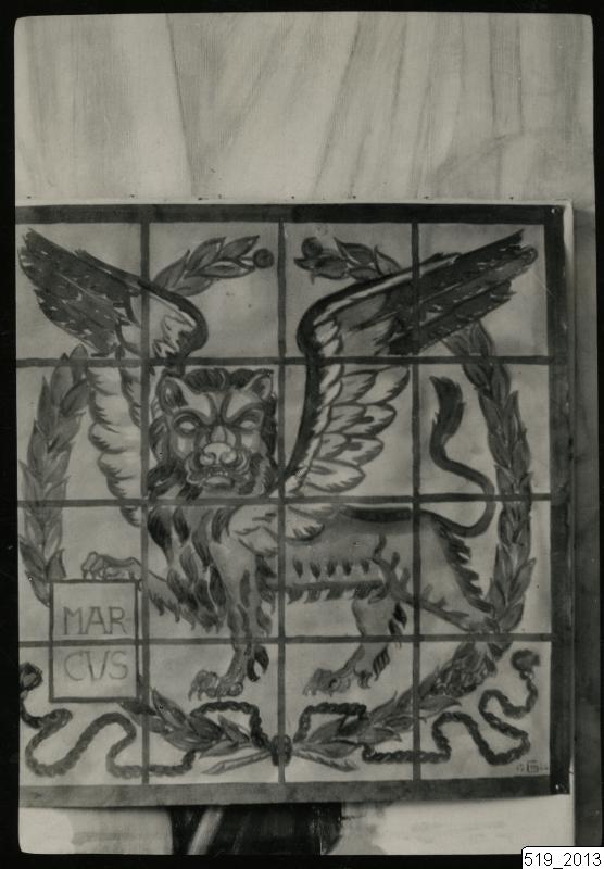 Målningen föreställer en religiös figur. Ett lejon med vingar, som är omgiven av en lagerkrans. Texten Marcus.