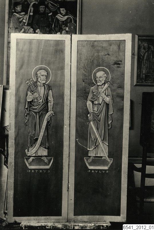 Bilden visar kyrkmålningar av Hugo Gehlin. Motivet är apostlarna Petrus och Paulus. Troligen är det målningar på luckorna till altarskåpet i Södra Sallerups kyrka.