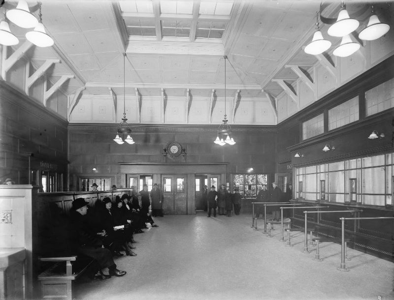 glasplåt, svartvitt fotografi föreställande interiörbild av Ångfärjestationens, uppförd av SJ år 1898 efter att Staten övertagit Skåne-Hallands järnvägsaktiebolag 1895