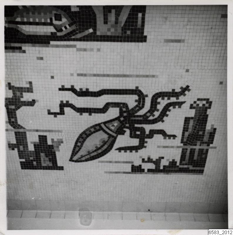 Bilden visar en del av en golvmosaik, Vattenlek, på badhuset på söder i Helsingborg. Mosaiken är lagd med material från Iföverken och motivet är havsdjupets djur- och växtvärld.