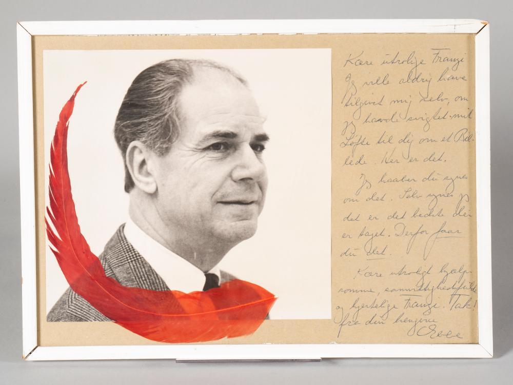 Fotografi föreställande den danske skådespelaen Ebbe Rode. Porträttbild snett framifrån, Ebbe tittar åt höger, iklädd rutug kavaj, vit skjorta och slips. På bilden har han skrivit: Kaere utrolige Franzi. Jeg ville aldrig have tilgived mej selv, om jeg havde svigtet mit löfte til dej om et billede. Her er det. Jeg haaber du synes om det. Selv synes jeg det er en det bedste der er taget. Derfor faar du det. Kaere utroligt hjulpsamme, samvittighetsfulle og hjertlige Franzi. Tak! Fra din hengivne Ebbe. På fotografiet finns också en röd fjäder.