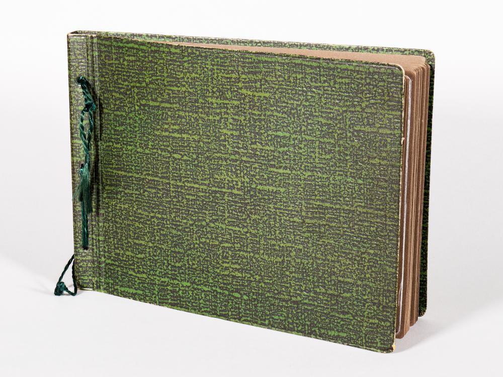 Fotoalbum med pärmar av grönfärgat skinn som har ett grönst snöre i ryggen. Albumet innehåller fotografeir och tidningsartiklar från revyn Vårluft åren 1944 till 1945. I albumet ligger också program för revyn åren 1950, 1956 och 1960.