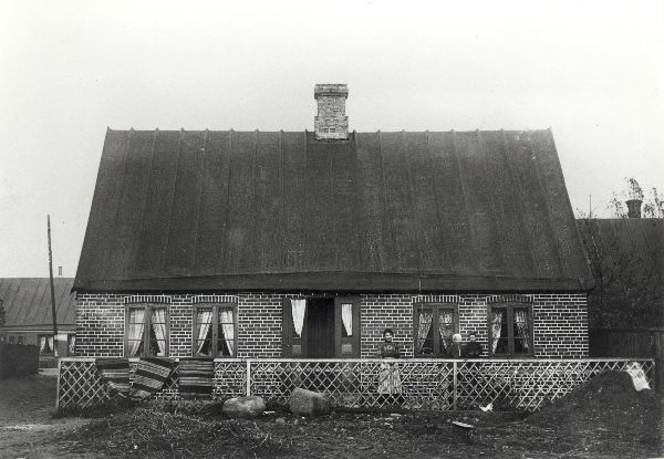 Bilden visar ett bostadshus på Missionsgatan 16. På bilden syns ett lågt murat hus med glasade trädörrar. Huset har ett staket som skiljer huset från resten av marken. Vid staketet syns en kvinna och två barn. I bakgrunden syns andra hus.