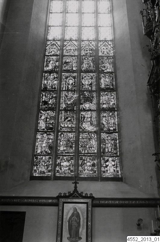 Bilden visar en glasmålning i en kyrka, okänt var den finns.