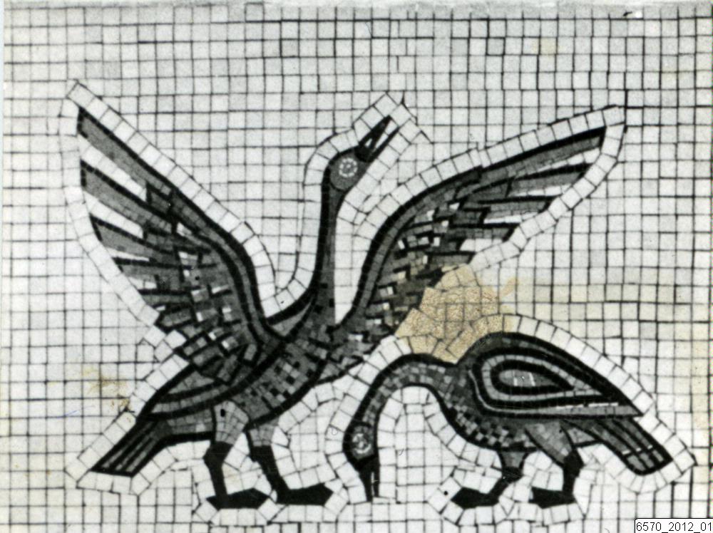 I bildens övre del finns två fåglar som är en detalj av Hugo Gehlins mosaik Djur i paradis. I övrigt upptas bilden av en dörr med glasruta.