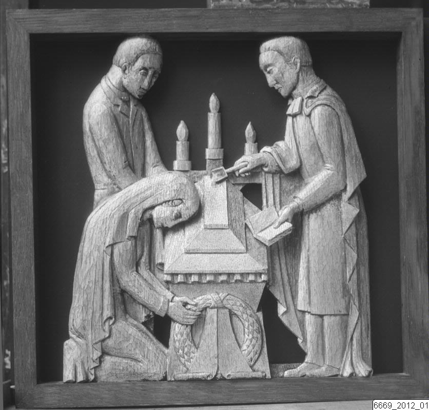 Bilden visar en genombruten relief som är utskuren i ek och förgylld utan kredering. Motivet är en begravning i kyrkan. Prästen står till höger om kistan. Till vänster står en man, och vid hans sida ligger en kvinna på knä och lägger en gravkrans nedanför kistan.