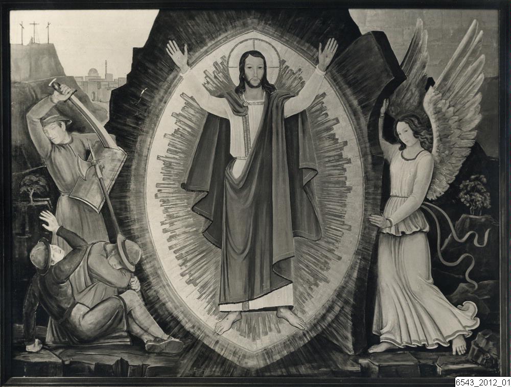 Bilden visar altartavlan i Norra Åkarps kyrka, målad av Hugo Gehlin 1931. Motivet är Jesu uppståndelse.
