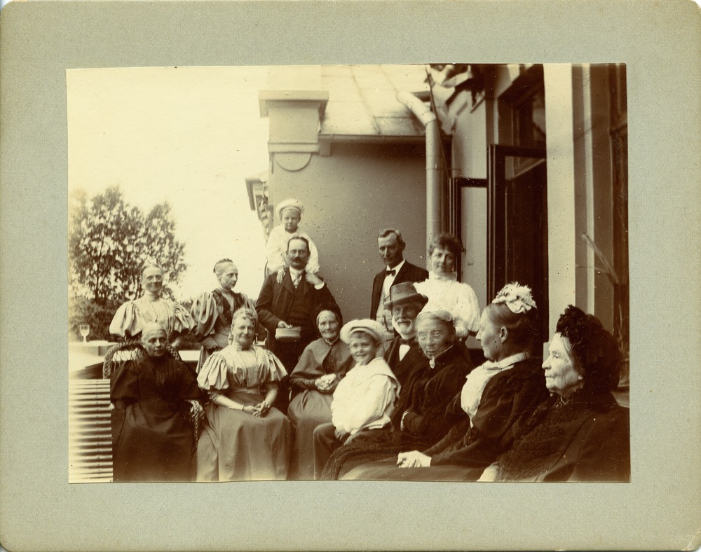 Gruppfotografi av medlemmar ur familjerna Kalling och Bäcklund. Fotografiet taget på Stens balkong enligt text på baksidan. Sten Kalling bodde i Villa Alliero med sin familj.