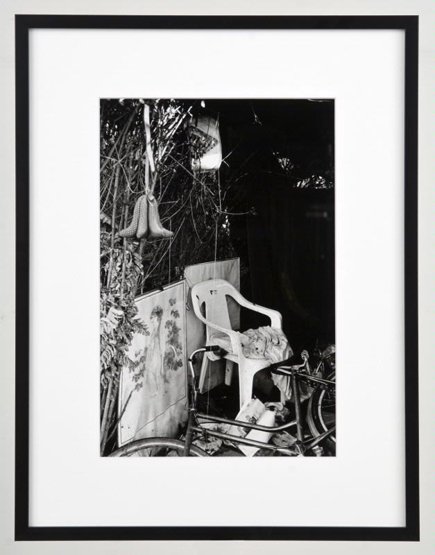 Svartvitt fotografi föreställande en bostad med plaststol, cykel, filt, affischer och tygtrasor. Bostaden ligger i buskarna vid parkeringen mellan Malmöleden, Söderviadukten och Järnvägsspåret. Glasad och ramad inom svartmålad träram samt med vit passepartout.