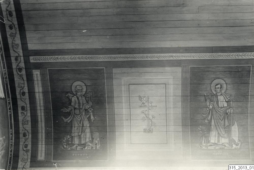 Målningarna föreställer apostlarna Petrus och Matteus, samt ett kors omgivet av blommor och en fågel.