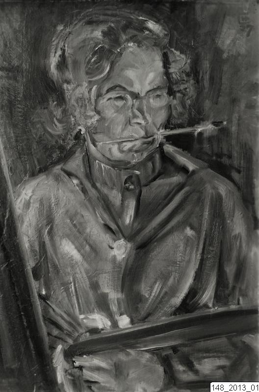 Bilden visar en stafflimålning, Målarinna i aktivitet 1927, av Hugo Gehlin. Porträtt av Esther Gehlin i arbete.