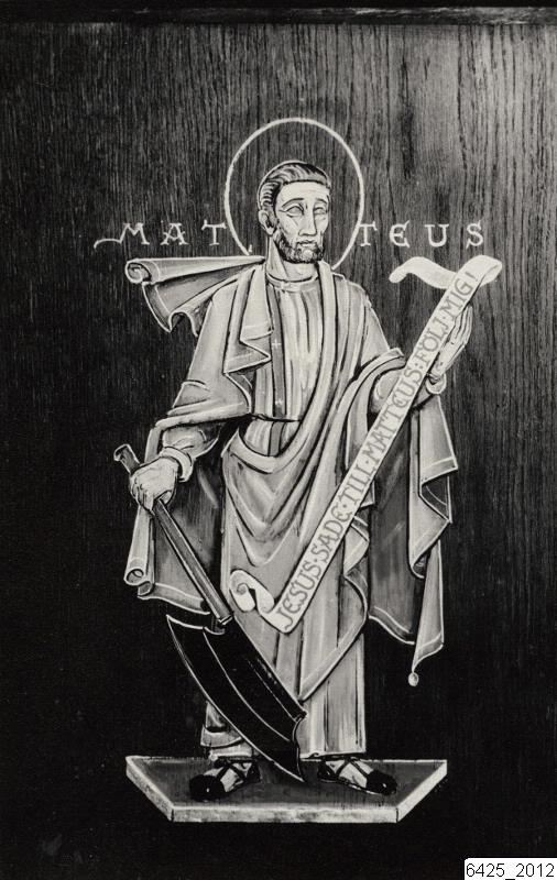 Bilden visar en målning av aposteln Matteus, på en bänkskärm i Mariakyrkan, målad av Hugo Gehlin.
