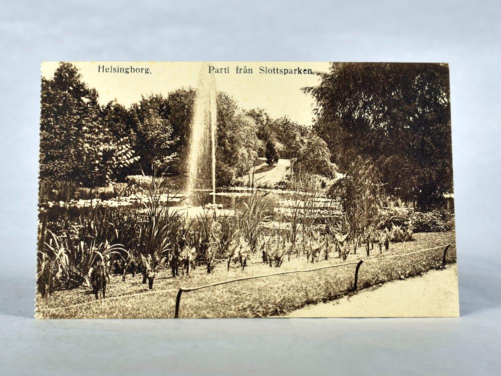 Svartvitt vykort med vy över ett parti från Slottshagen i Helsingborg. Bilden är tagen under tidigt 1900-tal. På baksidan finns plats för att skriva.