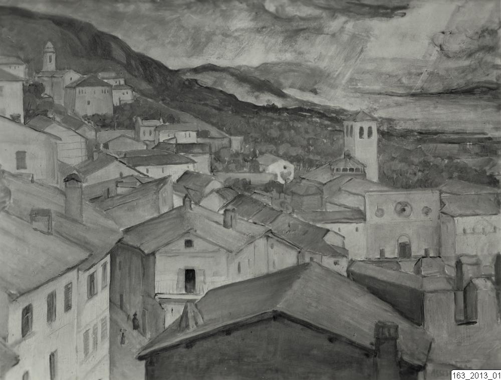 Beskrivning: Bilden visar en stafflimålning, Utsikt över Assisi 1921, av Hugo Gehlin. I förgrunden stadsbebyggelsen i Assisi, och i bakgrunden landskapet.