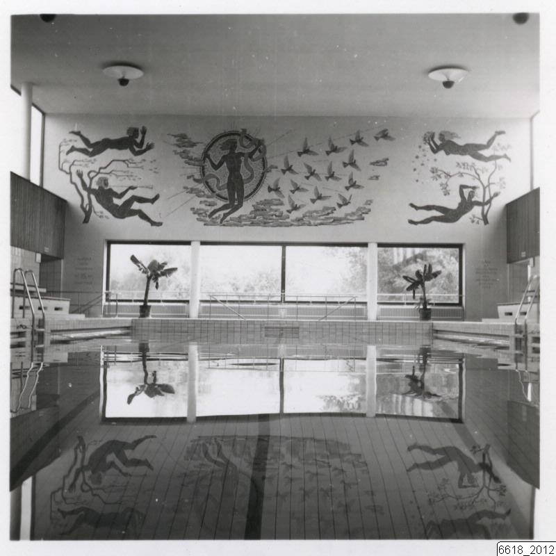 Bilden visar mosaiken Aurora och Vindarna i Trelleborgs simhall, skapad av Hugo Gehlin 1942-43. I bildens nedre del bassängen. I bildens mitt panoramafönster och mosaiken som täcker hela kortväggen. I taket två lampor.