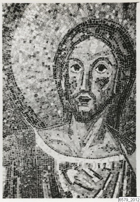 Bilden visar en detalj av Joakim Skovgaards mosaik Uppståndelsen i absiden i högkoret, Lunds domkyrka. Motivet är Jesu huvud.
