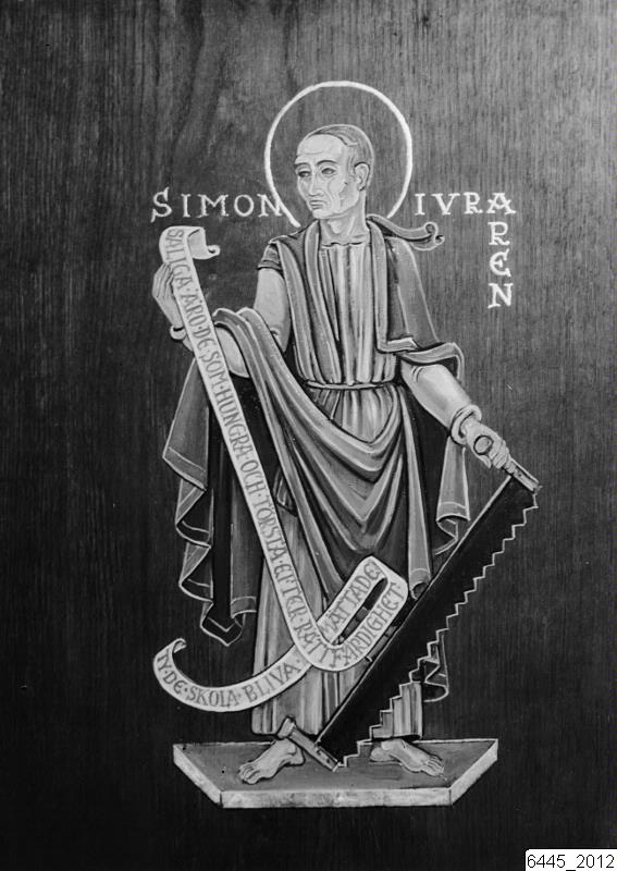 Bilden visar en målning av aposteln Simon Ivraren, på en bänkskärm i Mariakyrkan, målad av Hugo Gehlin.