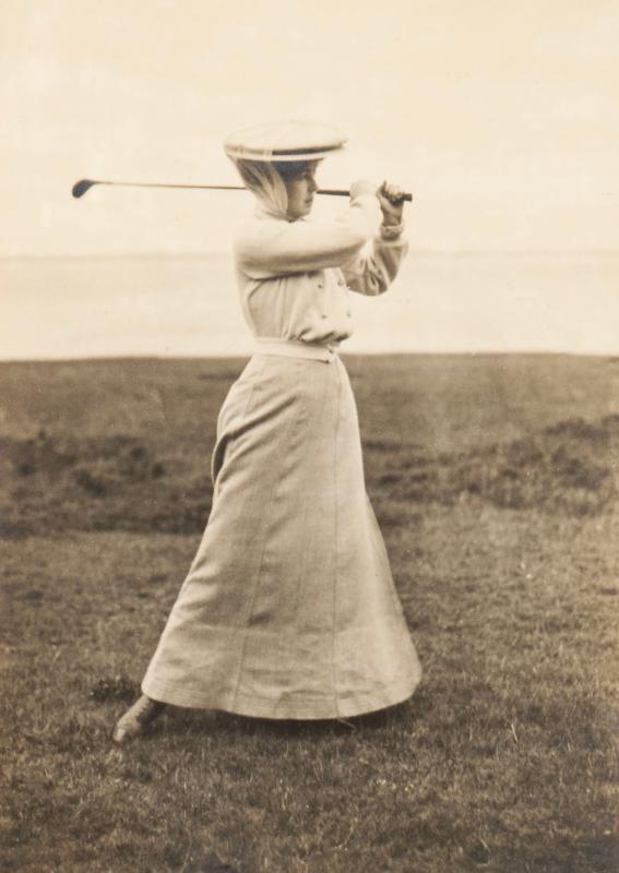 Svartvitt fotografi inom glas och ram föreställande kronprinsessan Margareta som spelar golf.