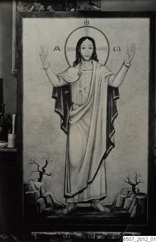 Bilden visar en del av altarskåpet i Södra Sallerups kyrka, målat av Hugo Gehlin. Motivet är målningen i mitten med Jesus i helfigur.