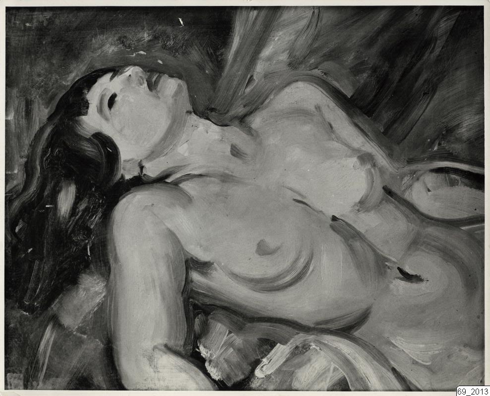 Bilden visar en stafflimålning, Halvakt, av Hugo Gehlin. En naken kvinna ligger usträckt.