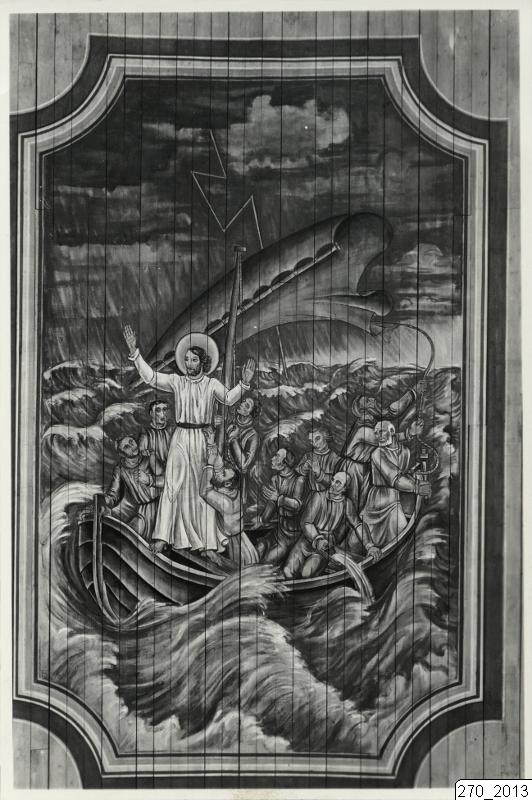 Beskrivning: Bilden visar en takmålning i Allhelgonakyrkan i Helsingborg, av Hugo Gehlin. Målningen föreställer en biblisk scen.